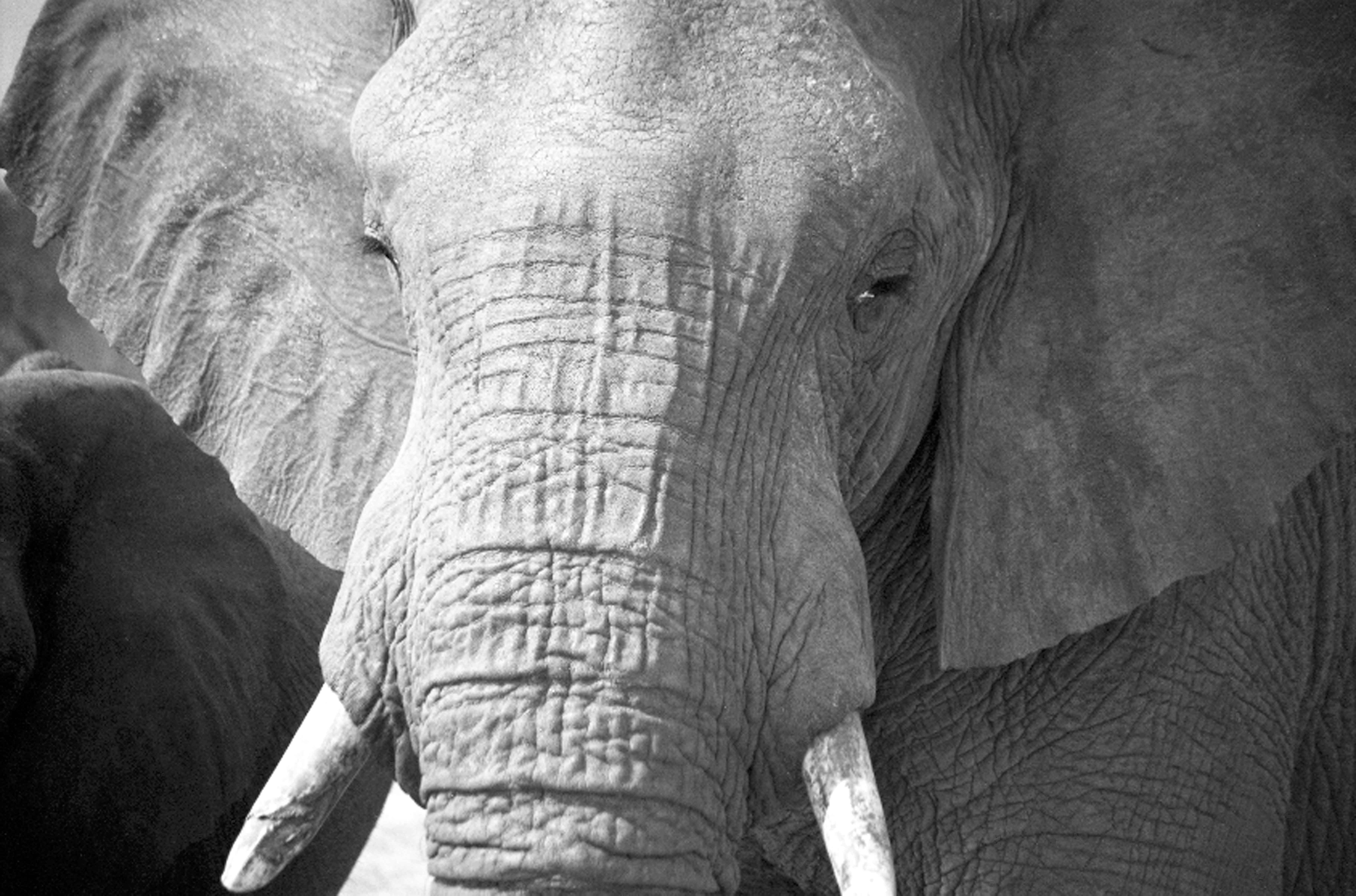 Behind us, close enough to touch with an outstretched arm, a huge female chuffs and huffs at regular intervals, locomotive-style.  Hunched and folded, I turn my head slowly to look into her left eye.  Her trunk periscopes into an s-shape, swivels, and tests the air in my direction.  Her massive body blocks our only way out.  She rocks back and forth, side to side, grows quiet.  Small and cold, I drop my head, totally at her mercy, if she knows such a thing.