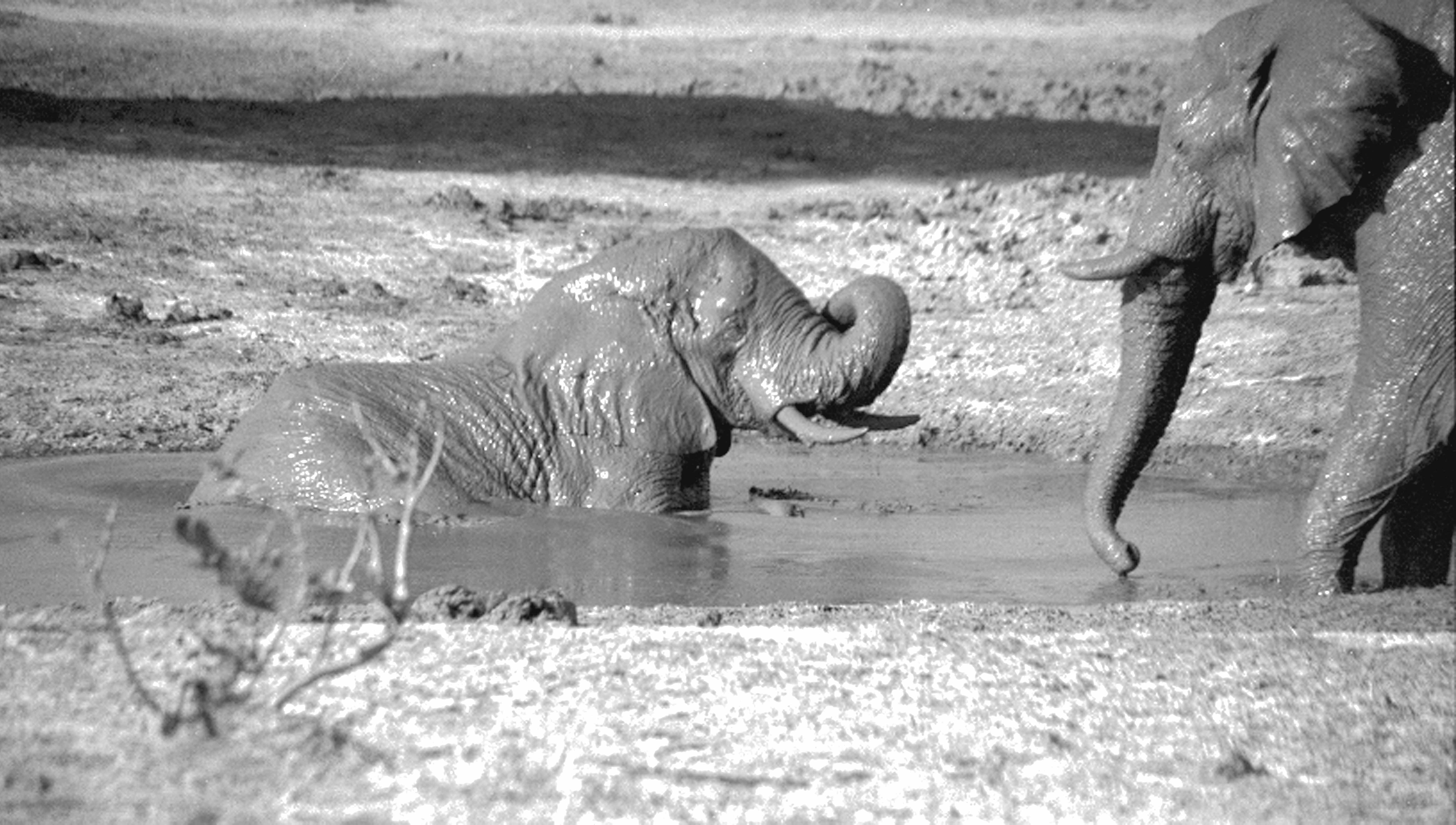 It’s a mucky, slimy, gloppy mud. The young elephant snorkels on his side, the tip of his trunk swiveling above the surface, as he slides towards another bull. His days are filled with heat and dust.