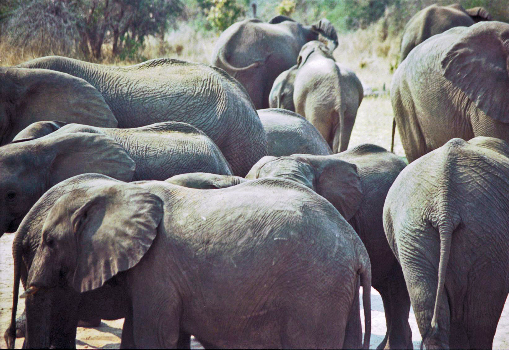 He trails his trunk, knuckling the ground, leaving smooth marks like a giant side-winding snake. A creature bigger than most monuments is on the move, yet his movements are loose and his pace casual. He reaches out and rubs the bottom of his trunk across a cow elephant’s backbone.