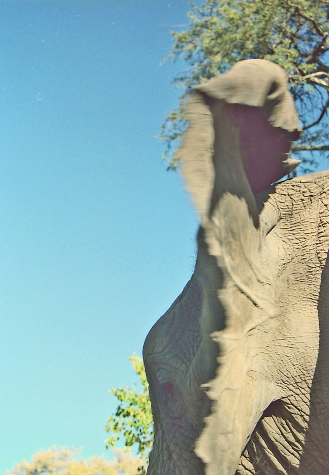 Because of the way she’s standing, ears flattened against her shoulders, Morula seems slim, her skull almost hollow. The tip of her trunk flops over itself in a loose coil and points down like a curved arrow. It begins to twitch in an irregular rhythm. I take the lens cap from my camera and glimpse a tiny reflection of myself in its mirror. Is this what she sees – another one of those small humans, with its odd upright stature? Does she see details: my hat, my camera, my idiotic grin?