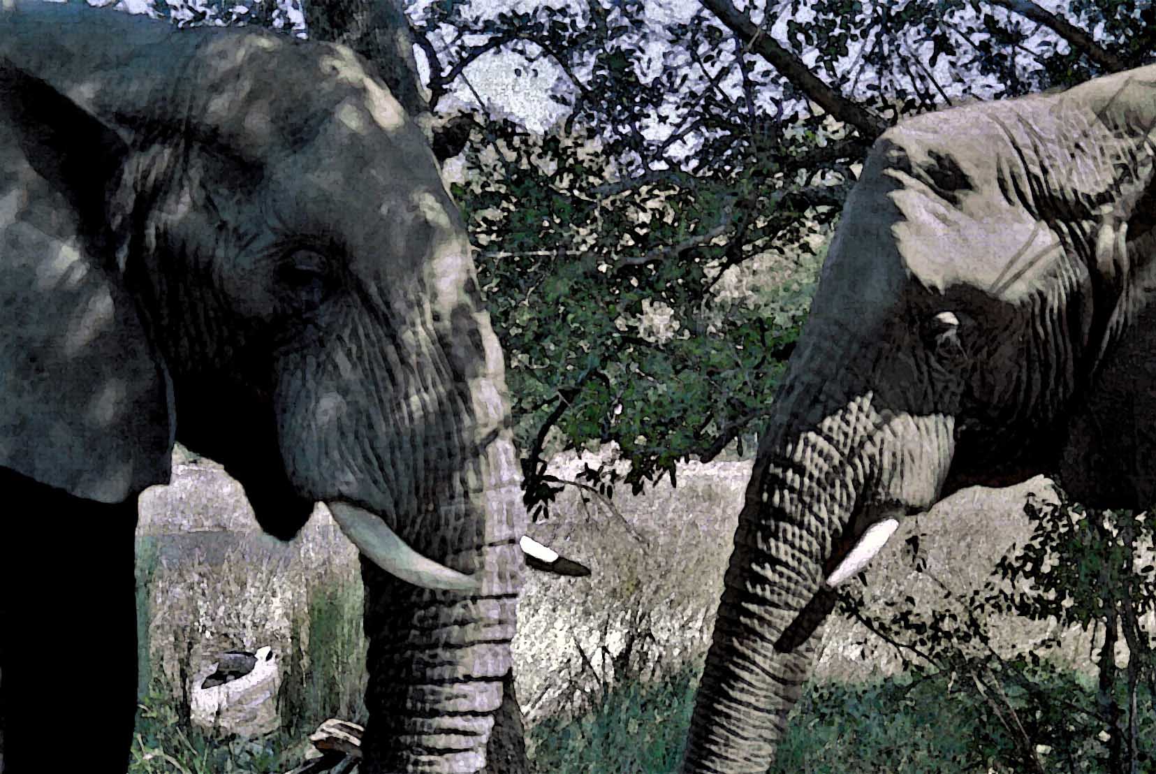 Photographs are moments caught, then left behind. In this photograph, at that moment, there’s so much going on. An elephant strolls by, eating a branch from a thorn bush while he wraps a stalk of grass in his trunk. Do you see his broad toenail, his scalloped ear with its large veins? Do you see the small round pebble on the top of his head, the flecks of leaves cascading down his forehead to his trunk? Do you notice the perfect fan palm in the background, the outline of a nipple upon his chest? Or is your attention focused solely on his gleaming white tusks and your furiously beating heart?
