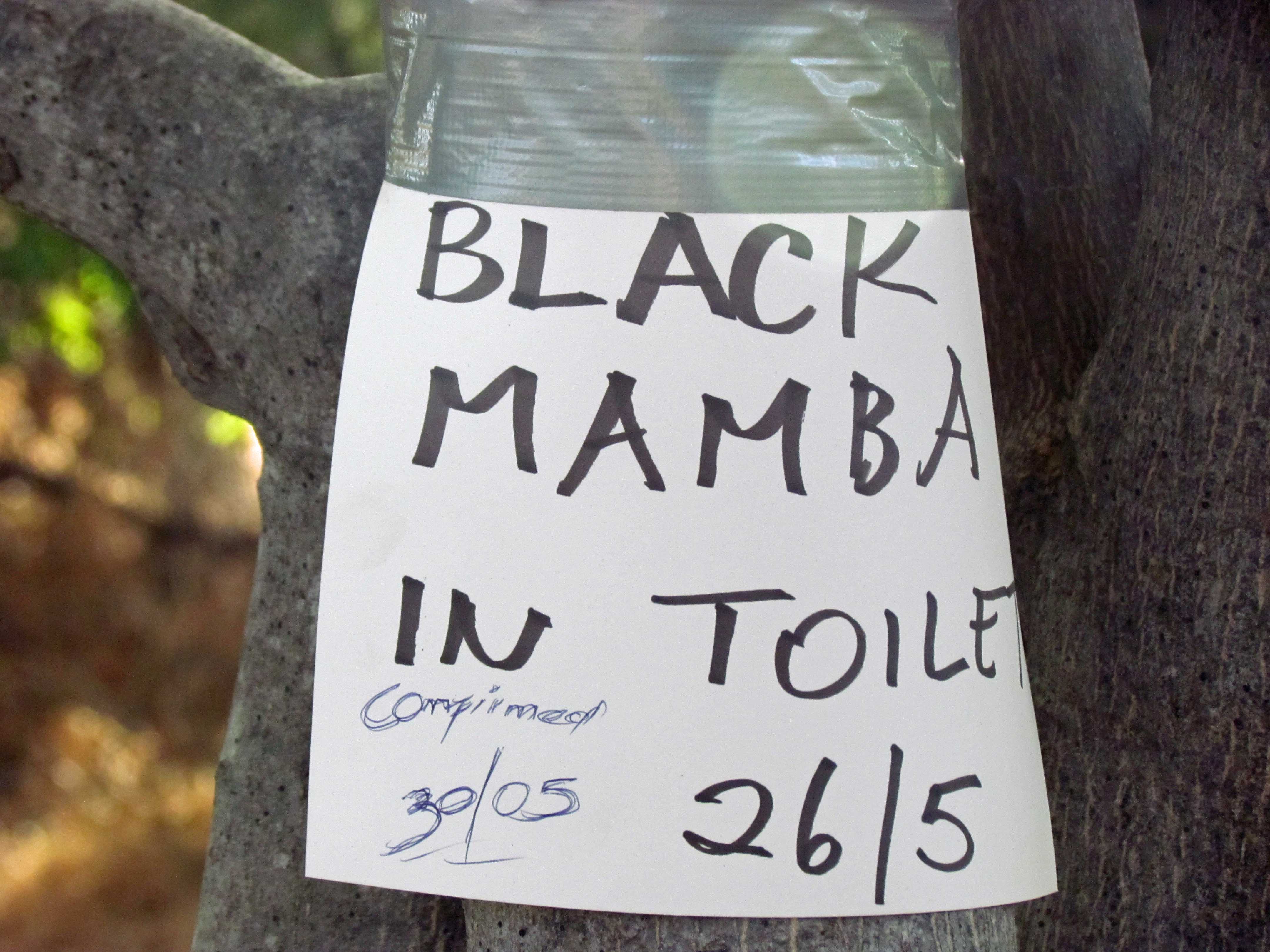 Certainly I’m not tempted to look inside. After all, the second message (“Confirmed 30/5”) was written just three days before our arrival by someone a lot more curious than I am about deadly snakes. The mamba is most likely still in there. Who wants to reconfirm a reconfirmation? Mambas are territorial; they will always return to their lairs, although that’s usually in an abandoned termite mounds or a hollow tree, rarely, I’d bet extremely rarely, in a toilet. A mamba is diurnal, active both night and day. It could be sleeping in there. Or not.