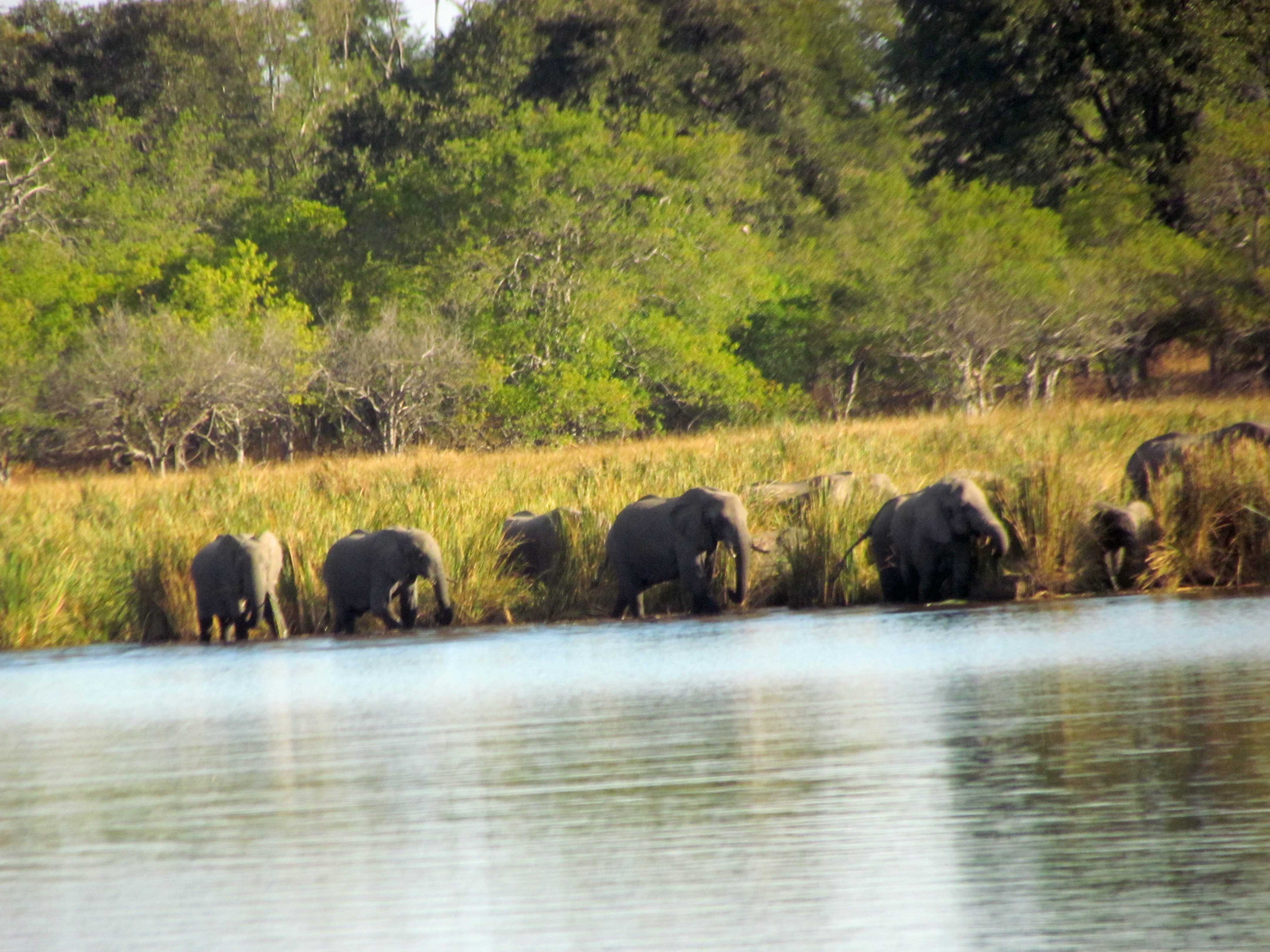 On the far side of the river, specks in the distance, a huge herd of elephants splashes along the edge of a reed bed. After I check for mambas, I lean on the rail of the platform to steady my camera. I use the digital zoom to take a picture, already knowing it will be an extremely low-pixelated shot. The elephants are in constant motion, appearing and disappearing in the reeds, so the photo turns out fairly blurry, but at least I have proof that those specks were really elephants.