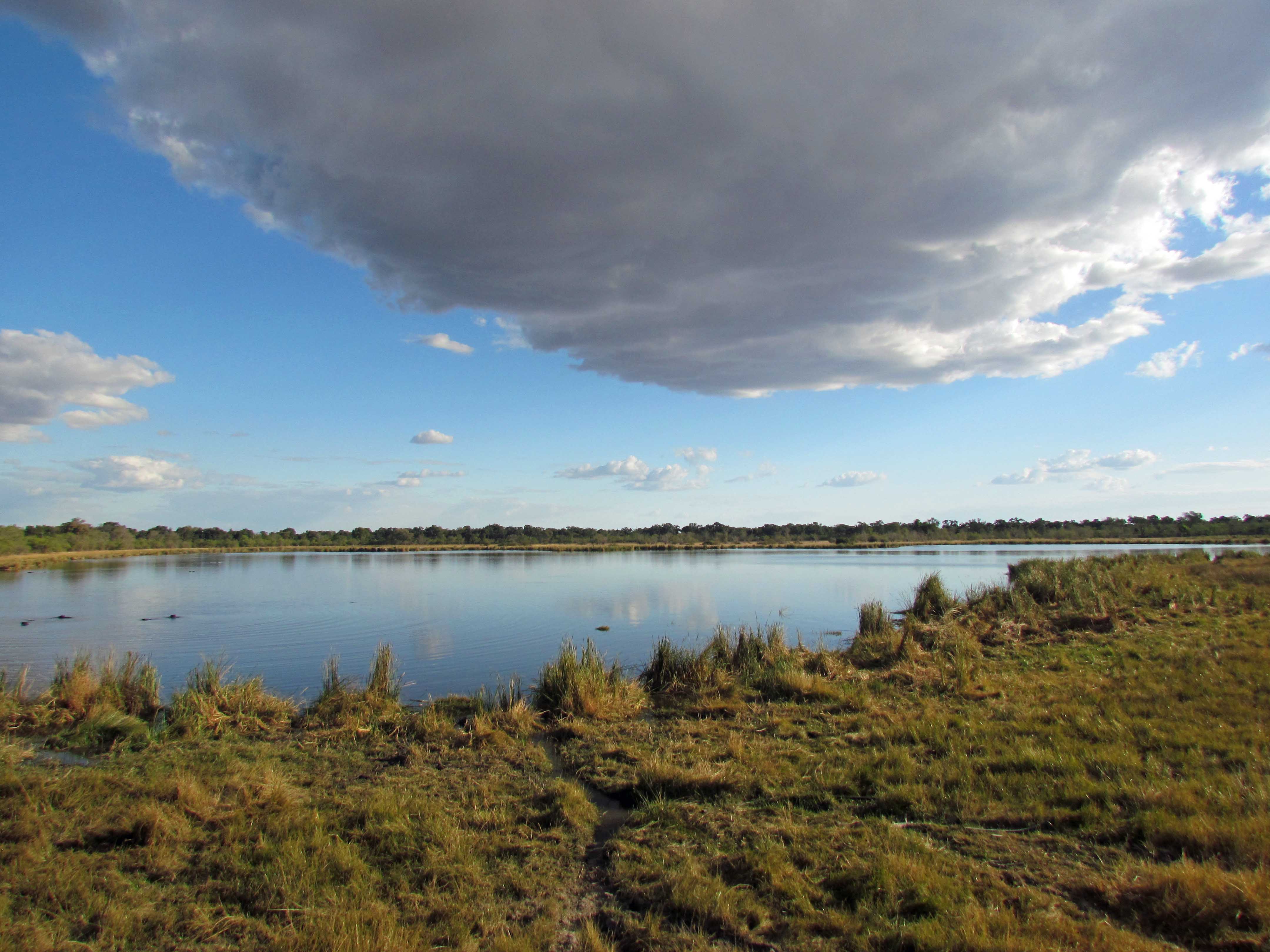The view from the platform is wonderful. A massive cloud hangs over the hippo pool and puffs of other clouds reflect in the tranquil water. A dozen hippos rise and sink, burbling like submerged tubas. Tracks in the grass are hippo paths, where the hippos come out of the pool at night to feed, foraging as far as three miles for sweet young shoots.