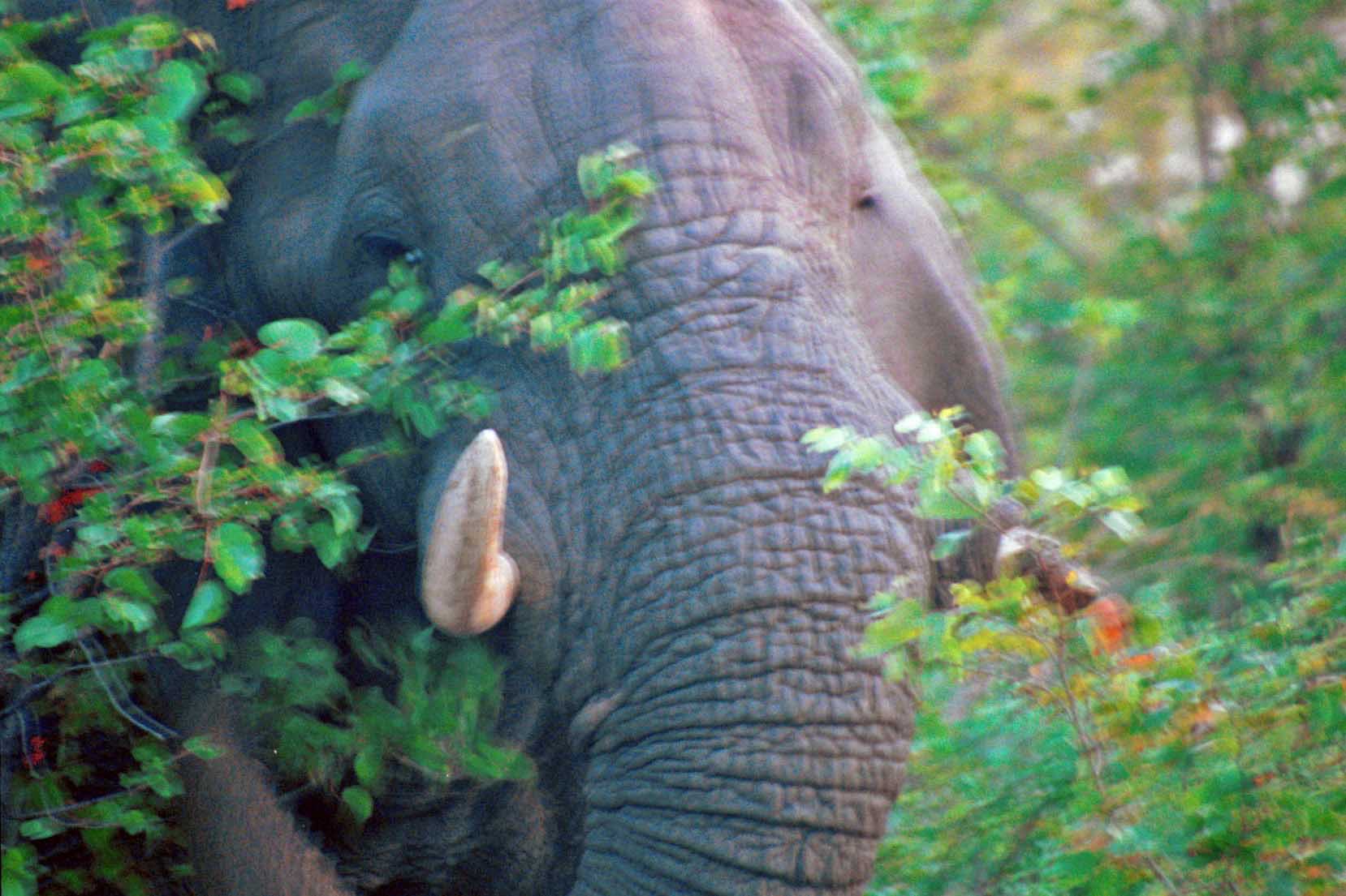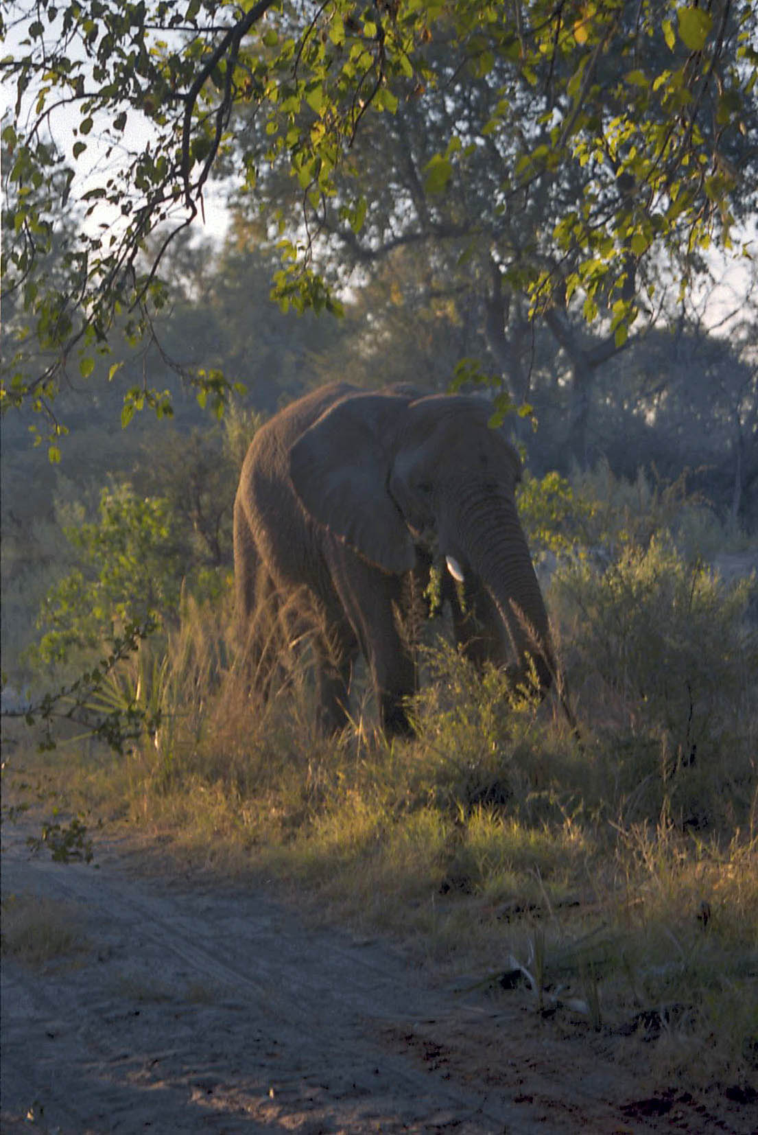 In the early morning light, on safari in the Linyanti area of Botswana, we disturbed an older bull at his breakfast. He’s moving toward us, not pleased but not totally threatening; we’re moving away. Even with everything in motion, there’s this shot.