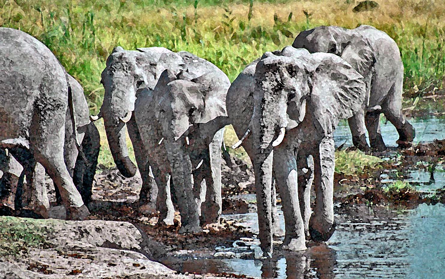 On the far side of the river, specks in the distance, a huge herd of elephants splashes along the edge of a reed bed. After I check for mambas, I lean on the rail of the platform to steady my camera. I use the digital zoom to take a picture, but it’s an extremely low-pixelated shot. The elephants are in constant motion, appearing and disappearing in the reeds, so the photo turns out fairly blurry, but at least I have proof that those specks were really elephants.