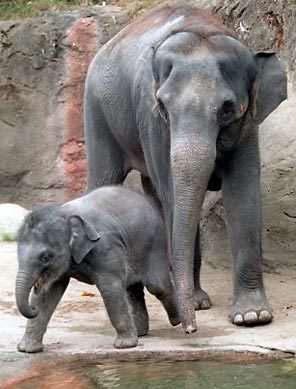 Finally pregnant, she was trucked back to Seattle.  Twenty-two months later, in 2000, she gave birth to a female calf.  The naming contest for the new zoo resident gathered 16,000 entries.  The Thai name selected, Hansa (pronounced HUN-suh), means “Extreme Happiness.”  Once the calf was on view attendance at the zoo doubled and Chai proved to be a very capable mother.