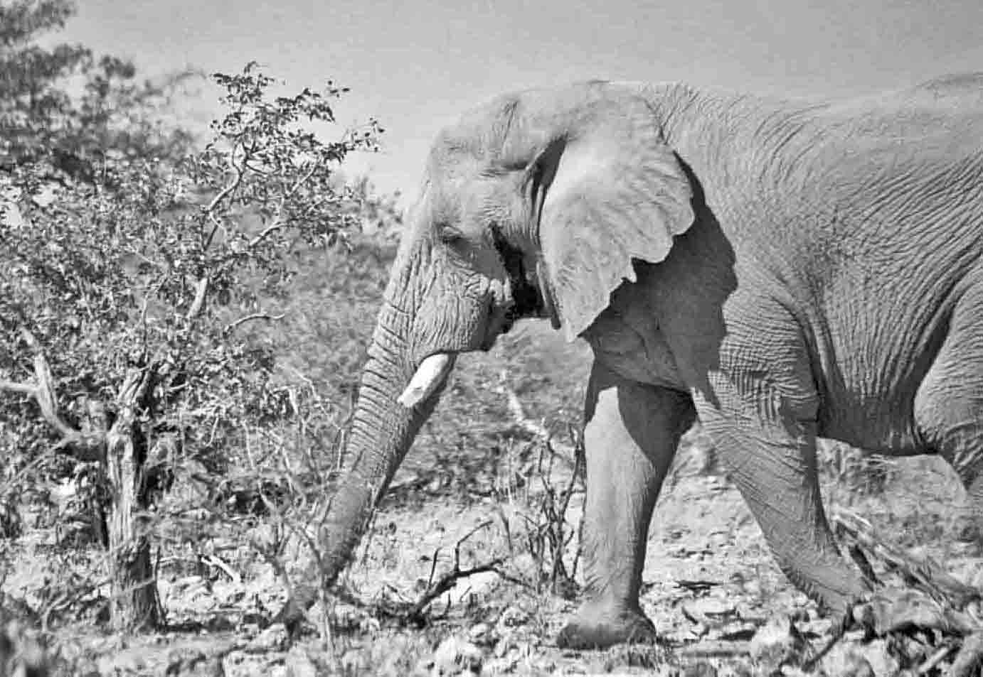 One hot, dry afternoon, two male elephants, Mohammed and Hannibal, picked their way through the white calcareous rocks around the waterhole and paused for a drink. As soon as the two bulls arrived, the tower radioed the van. Selected at random, infrasonic estrous calls of a female elephant from Kenya were broadcast to the two bachelors in Namibia.
