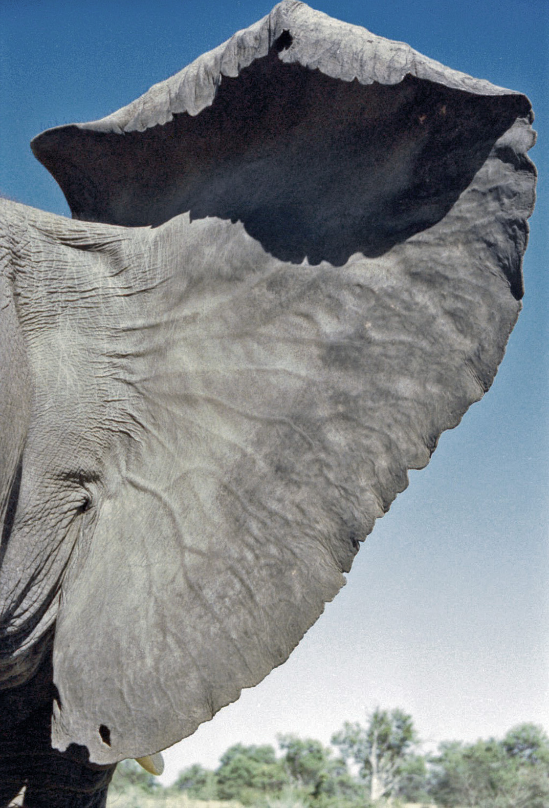 And no two elephant ears are the same. As pliable and soft as worn canvas, the leading edge of an elephant’s ear is often caught and torn on branches or by the tusks of other elephants. In Kenya I watched an adolescent flare her ear and trace its outline with her trunk like a matador holding out her cape. Backlit by sunlight, three perfectly round holes on its border reminded me of diamond studs. Nearby, a huge bull posed for my gulping camera as I shot an entire roll of film in less than two minutes. Only later, with the film developed and the prints in my hands, did I notice the edges of his ears were as scalloped as an old lace tablecloth.