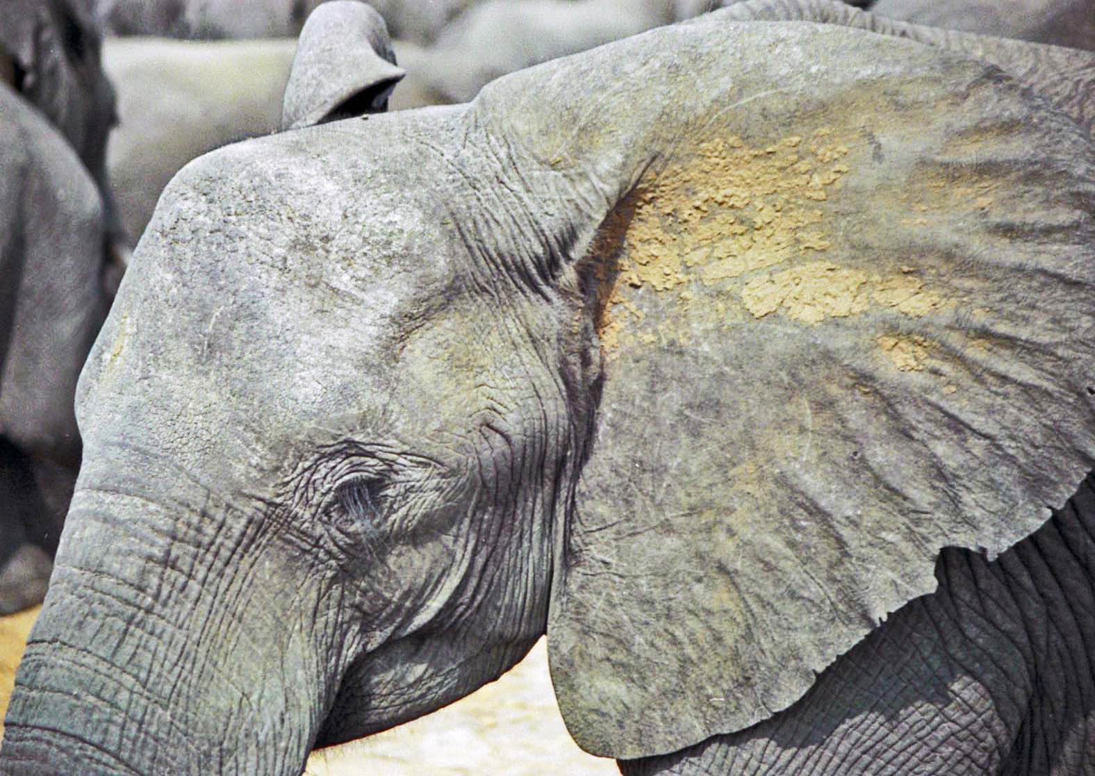 A young female strolls by, scans us as if we’re department store mannequins. She’s so close all I can do is snap a picture of her eye. She stops, blinks, and regards us with the air of a disinterested shopper. I look down at her feet, round in front, oval behind. The round one is about the size of a medium pizza pan. I glance back up, directly into her eyes. She stares back and shakes her head so hard that her ears flap. A great cloud of dust rises from them. Then she moves on.